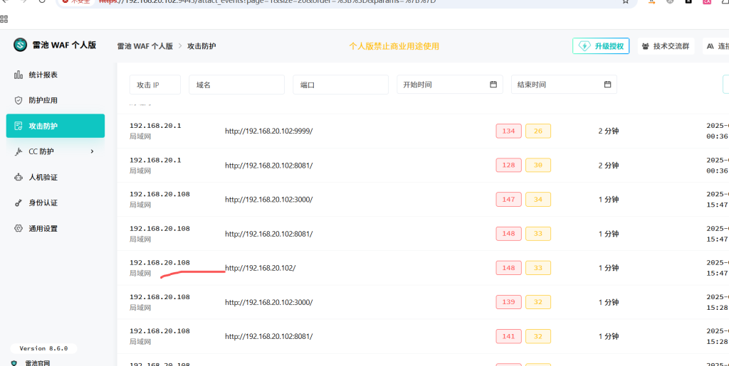 在雷池waf中,192.168.20.108是资产表中的sshServer主机的地址,这个主机是我们的资产,且在