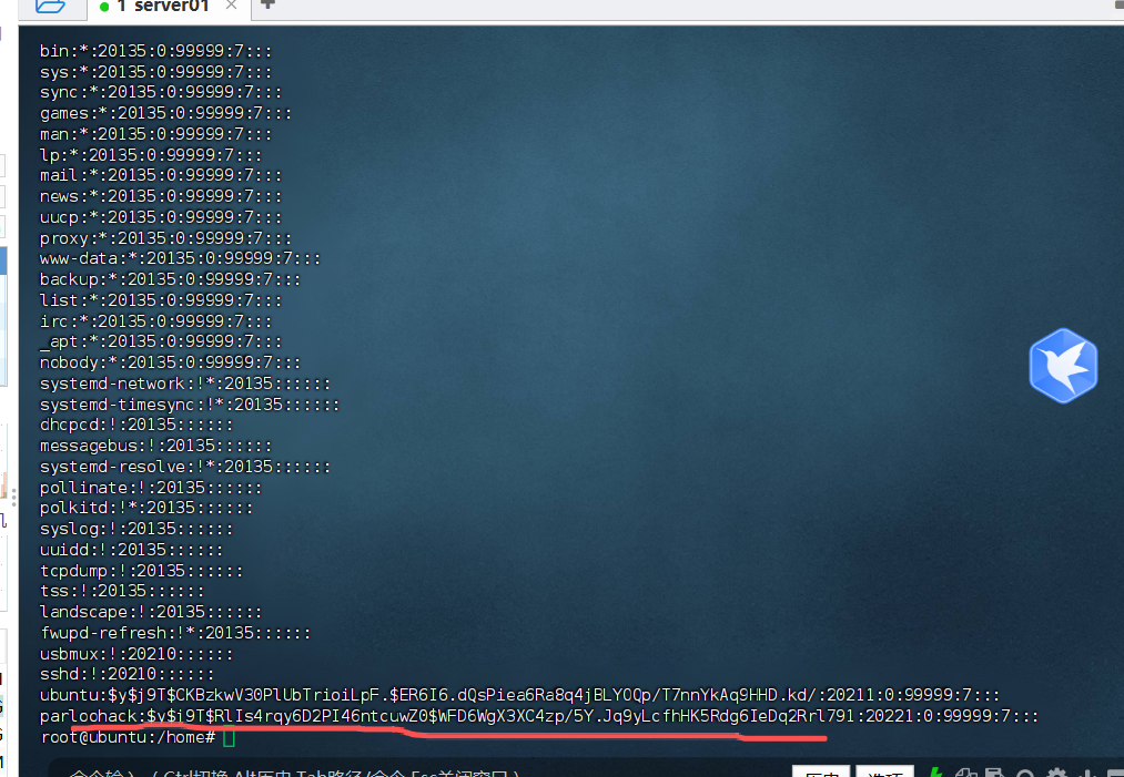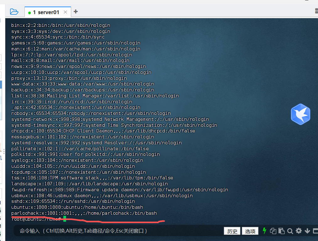 发现最底下有个parloo用户 ,拥有/bin/sh所以可以怀疑是攻击者